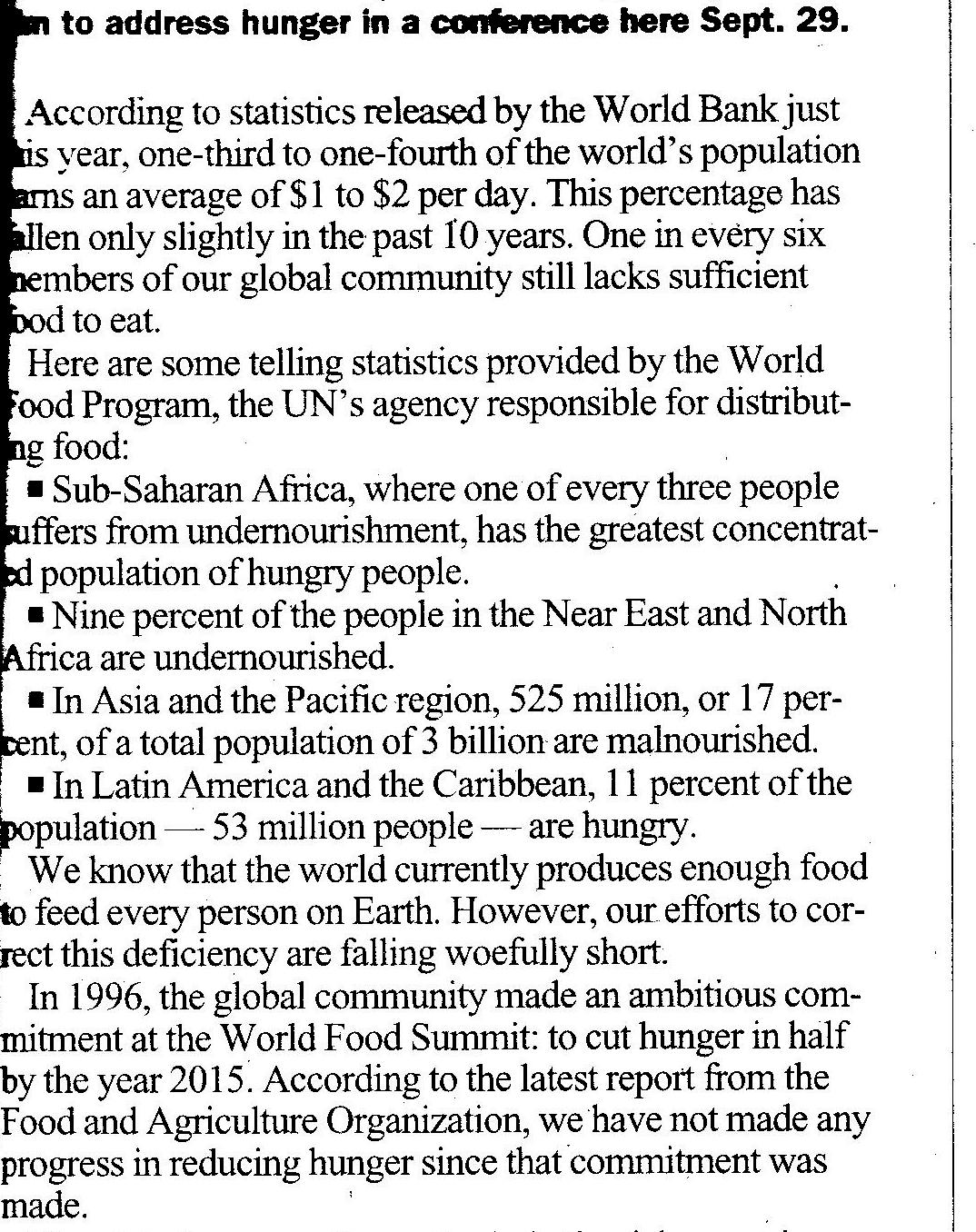 Here is a piece that Ruth Hoffman of the Lutheran Advocacy Ministry-New Mexico (then called the Lutheran Office of Governmental Ministry, LOGM) wrote exactly 15 years ago, on Sept. 14, 2001. We put together the piece, partly to promote a join conference on hunger sponsored by LOGM and Bread for the World on Sept. 29. The keynote speaker was Rev. Arthur Simon, founder of Bread for the World. Here are scanned images of the piece.